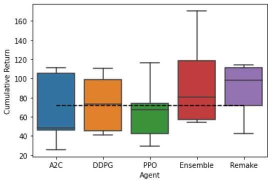 The first is the number of experiments. For more objective experimental results, we conducted five experiments and for each agent, and we compared and analyzed the evaluation metrics obtained through each agent. Ref. [10] only shows the results of a single experiment. Since we believe that the results of a single experiment alone are not adequate for judging the robustness of an automated stock trading system, we ran five backtesting experiments on each trading agent. We calculated the average value of each based on the five evaluation metrics. The results are shown in Table 1. In particular, we considered the cumulative return as the main criterion among the five evaluation metrics because it is the final benefit obtained through stock arbitrage. Figure 3 visualizes this evaluation metric in a box chart to make it easier to compare each agent’s experimental results and the DJIA.