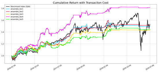 Second, the duration of the data employed for trading is different. There was no need to preprocess the data separately because we used the refined Dow Jones 30 data that [10] used. As in [10], we used data from 1 January 2009 to 30 September 2015 for training, and validation data were from 1 October 2015 to 31 December 2015. However, we set the trading period from 1 January 2016 to 6 July 2020, while [10] set the trading period from 1 January 2016 to 8 May 2020. Currently, the number of days of stock market opening used in the test was 1071 days in the case of [10], and in our case, there were 1134 days in total. We fixed the validation window and rebalance window to 63 days as in the code provided and extended the trading period from the previous one, where rebalance window means the number of months to retrain the model, and the validation window is the number of months to validate the model and select for trading. There is a 63-day difference between the number of stock opening days used in the current work and the number of stock opening days we used.