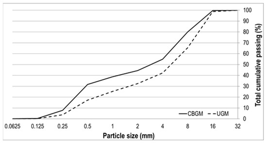 For the testing behaviour of a three-layer pavement structure, 3D-DIC was applied for pavement system monitoring. For this test, the pavement structure setup was comprised of unbound granular material (UGM), CBGM, and an asphalt-wearing course (Figure 2). The UGM course was made of a natural river gravel with the grain size distribution presented in Figure 1. The optimal moisture content and maximum dry density determined according to EN 13286-4 [37] were 4.79% and 2.01 g/cm3. The UGM was inbuilt by a vibrating hammer in mould with dimensions of 50 × 50 × 10 cm covered with geotextile, controlling the mass and geometry of the inbuilt material and calculating the water content and density of the unbound base layer after compaction. The UBM courses were made in such a way that their humidity deviated up to 1% from the optimum and with a degree of compaction up to a minimum of 98%. For each mixture, one sample of the UGM was made to reduce the influence of variations in the quality of this layer on the test results, but also to rationalise the amount of material and the time required for making the samples. As for the mechanical characteristics’ test presented earlier in the text, the CBGM course was made with the same materials. The CBGM was inbuilt in mould dimensions of 45 × 35 × 10 cm, in one layer by vibrating hammer compaction for 10 min. After compaction, the samples were left in the mould for 24 h and, then, unmoulded and cured for 27 days by covering them with wet cloth at room temperature. The wearing course was simulated by AC 11 surf slab dimensions of 40 × 35 × 4 cm, and it was made according to EN 12697–33 [41]. As an aggregate for the asphalt mixture, eruptive stone was used according to standard EN 13043 [42]. Before the test, the surface of the asphalt slab samples was painted white to increase the contrast between the points on the surface that were monitored by the 3D-DIC system, so as to make it easier to recognise the stochastic pattern. For each cement content, three pavement structure setups were made.