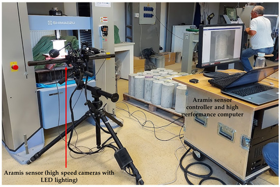 The digital cameras used in this research support a resolution of 2448 × 2050 pixels and are equipped with a CCD chip. The lenses have a focal length of 12 mm, and they are set at an angle relation of 25°. To ensure a full view of the specimen volume during all loading stages, the cameras were mounted at 280 mm from the cylinder face and were set to form 86 mm between each other. For this camera alignment, 0.005 mm2 on the specimen surface represents a pixel on the image. With the given hardware components, a strain accuracy of up to 0.01% was established, which was at all times controlled by the unit software monitoring of the mean points’ intersection deviation, which was kept lower than 0.1 pixels [43]. The testing preparation included volume determination, system calibration, and specimen treatment. The calibration of the cameras was performed using a certified, coded calibration panel. Specimen treatment was performed by applying a white-colour spray stochastic pattern, since the specimen surface lacks contrast in its natural state.