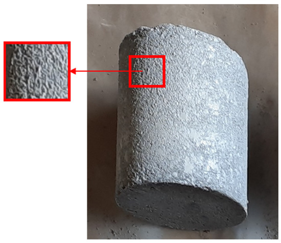 The standardised method EN 13286-43 [40] defines testing the CBGM modulus of elasticity. The guidance in this standard suggests that the modulus can be determined from compressive strength tests, direct tensile tests, or indirect tensile tests. Although these static test methods are usually used to characterise the CBGM, there are numerous difficulties and problems in the very procedure of testing and measuring the modulus of elasticity. The biggest challenge is the correct measurement of the displacement given the rough, uneven, and, at times, loose surface of the samples (Figure 4). As pointed out in [44], test results can be inconsistent, varying greatly among samples within the same mixture, making this method difficult and time-consuming. Therefore, in this research, the 3D-DIC method was applied for the non-contact measurement of sample displacements and deformations with the calculation of the modulus of elasticity according to the specified norm.