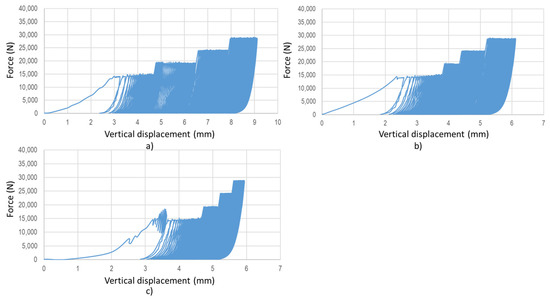 Force–vertical displacement curves for selected samples of the CBGM with (a) 3%, (b) 5%, and (c) 7% cement content.