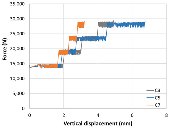 To obtain clearer and more precise information on the pavement system behaviour, from the individual force–displacement curves, the initial state of system “adjustment” was removed, and the envelopes of individual cycles are presented in Figure 6. For a 7% cement content CBGM pavement system, a very small total displacement was recorded, while those for a 5% and 3% cement content were relatively similar, but with different displacements levels achieved at different loading cycles. Such a pattern of behaviour points to the conclusion that, in the case of the system with 7% cement content, cracks do not open at all, and therefore, no significant displacements occur. On the other hand, the behaviour of pavement systems with CBGM of 3% and 5 % cement content points to cracks in the lower layers having opened, but at different loading stages, which are then manifested in different ways in the force–displacement record.