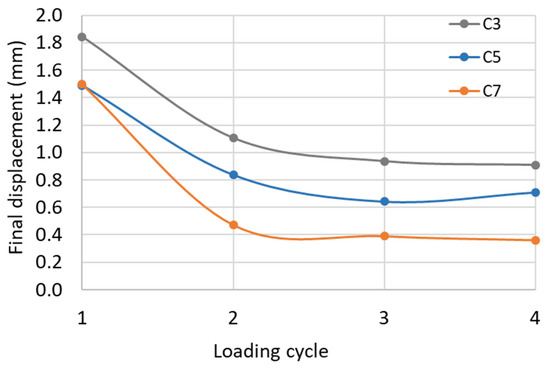 Analysing only irreversible displacements within a particular loading cycle for each of the samples, earlier indicators were confirmed, and additional behavioural indicators were revealed. Namely, the sample with 7% cement content achieved the largest residual displacement in the first stage of loading, and the displacement decreased with each following loading cycle, indicating that no cracks had formed. The reduction of the residual displacement by each following loading cycle was exclusively related to the decreasing space for free deformations between the layers and the gradual load bearing through the deformation of the materials themselves. Figure 7 shows the achieved displacement at the end of each loading cycle for each cement content.