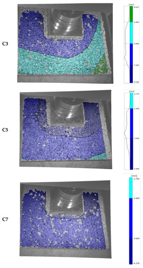 Based on the field of deformation data for each of the series, some insight can be gained. As the load cycles progressed, from first to fourth, and stresses increased, the trends of deformation for each mixture type were amplified, meaning that the end of the last cycle can offer much information regarding broader behaviour, such as non-localised behaviour. Figure 8 enables such an insight with an overlay of the vertical displacement fields on the asphalt’s surface. Firstly, it is visible that the mixture with 3% cement content was the most flexible, in terms of the range of vertical deformation being around 9 mm. Additionally, there was visible localised behaviour without the possibility of a proper stress distribution in an area wider than the input load. This suggests a failure of the lower layers beneath the load and a lack of stiffness to enable a wider distribution of stresses. With an increase of cement content to 5% and 7%, the behaviour significantly changed, showing clear signs of greater stiffness, which was most visible for the lower range of deformation within the entire surface. It should be noted that the differences in behaviour between 5% and 7% cement content on the system level were evidently smaller than on the material level. Namely, the total range of deformation was within 0.5 mm (around 10%), and there was a gradual decrease in deformation away from the load introduction area. The 7% cement content system showed greater stiffness as there was a smaller area within the 2.4 to 3.6 mm range, which was to be expected due to the higher modulus value of the supporting layer. Nevertheless, the use of 7% did not seem to offer large enough benefits in comparison to the 5% cement content structure.