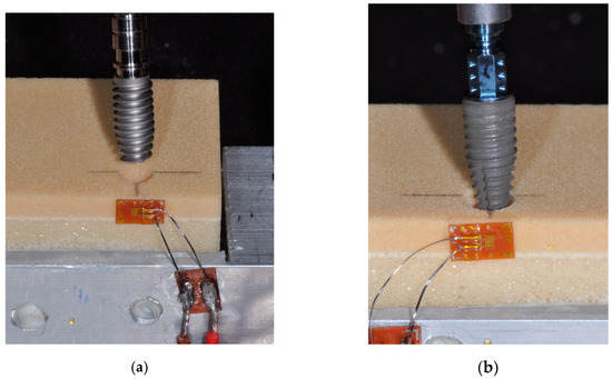 Figure 2. Insertion of a novel design AlfaGate implant (a) and a Straumann BLT implant (b) into osteotomies created in laminated polyurethane foam simulating alveolar bone. Strain gauges were positioned on the buccal aspect of the bone with the sensing elements oriented in the horizontal direction for recording deformation of the material.