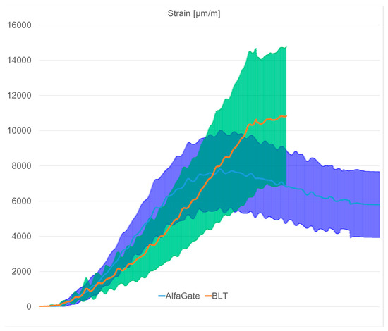 Figure 4. Strain development over time during implant insertion for both groups investigated with continuously increasing strain levels for Straumann BLT. Lower maximum strain was seen in AlfaGate implants coinciding with the bulky central part of the implant passing the cortical plate.