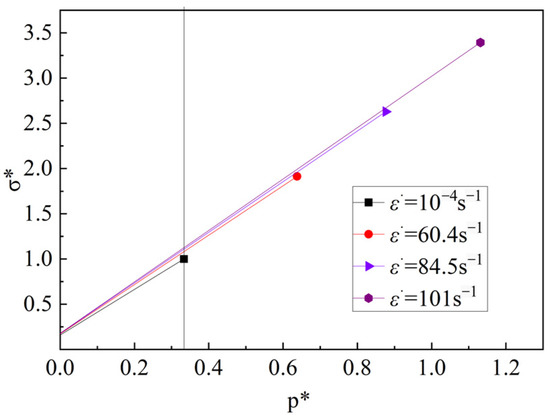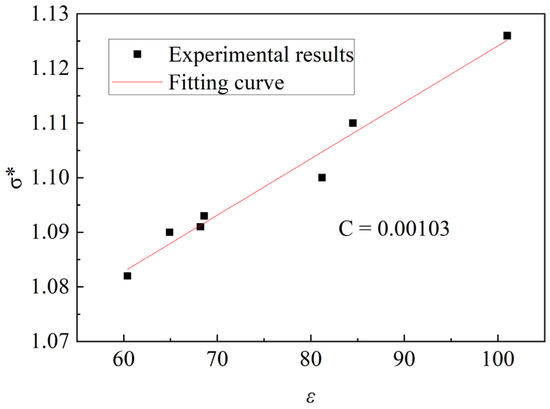 The strain rate constant C was determined using the SHPB test. To obtain the strain rate effect alone, the pressure effect must be removed. Figure 1 presents the technique used to remove the pressure effect and obtain the strain rate constant. Firstly, starting from the maximum hydrostatic pressure T*(T* = T/fc = 0.063), a straight line was drawn through each test date. Moreover, the slope of the straight line represented the strain A measure of the rate effect. Secondly, by making a straight line parallel to the vertical axis corresponding to the constant normalized pressure, p* = 1/3, and intersecting the straight lines with different slopes. The characteristic strength under the same constant normalized pressure with different strain rates can be obtained, and the pressure effect was removed. The strain rate constant C is obtained by fitting the data points from the characterized stress at different strain rates, C = 0.00103, as shown in Figure 2.