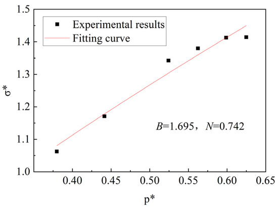 Triaxial compression tests were performed using a triaxial compression apparatus. Under different confining pressure conditions, according to Formulas (17) and (18), the different hydrostatic pressures p and the corresponding maximum differential pressure Δσ are measured. Normalizing maximum differential pressure Δσ as shown in Formula (19), a series of points (,) was obtained. Then, to obtain the values of the strength constants B and N, the data points were fitted as shown in Formula (20).