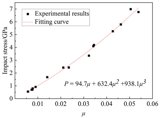 The values of K1, K2, and K3 can be obtained from the Hugoniot test for diorite. The parameters are derived from the existing research results and obtained by fitting, as shown in Figure 4. Based on the fitting results, K1 = 94.7 GPa, K2 = 632.4 GPa, K3 = 938.1 GPa. = 2.2 GPa is the pressure at which all the air voids are removed from the rock. is determined by providing the best fit to the data.