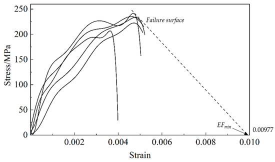 Figure 5 shows the stress–strain results for a cylinder subjected to SHPB cyclic compression loading test. An assumed failure surface is defined on the basis of the test results. The tangent line from the failure surface intersects with the x-axis, and the intersection point is EFmin. The value of EFmin is 0.00977, as shown in Figure 5.