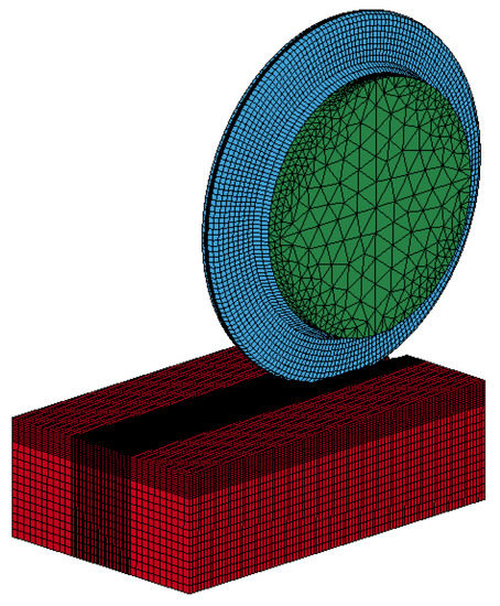 In this study, the rock mass is designed as a rectangle with length, width and height of 500 mm, 300 mm and 150 mm, respectively, as shown in Figure 8. The constitutive relation selected for the rock in the numerical simulation of rock breaking using a disc cutter is the HJC model of the diorite of the Jinan region, and the characteristic parameters of the HJC model are shown in Table 3. The contact between the cutter ring and the rock mass corresponds to eroding contact.