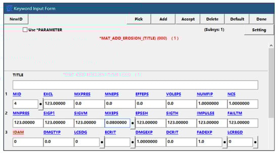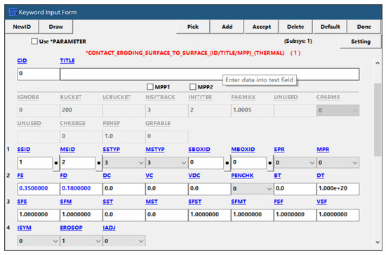 In terms of boundary conditions, the displacement in the x direction of the two sides of the rock is limited, and the bottom surface restricts the displacement and rotation in all directions, as shown in Figure 9a,b. Non-reflective boundaries are set on two sides, the bottom face and the face in front of the disc cutter forward direction, as shown in Figure 9c. For the disc cutter, translational and rotational constraints in two directions (x, y) other than the forward direction are set, so that the disc cutter can maintain its penetration and avoid deviating from the predetermined trajectory. In terms of rock breaking, an additional keyword (MAT_ADD_EROSION) is set for the HJC model, which allows each unit of the rock to be deleted after its maximum principal strain reaches a predetermined value. The parameter settings are shown in Figure 10. In addition, the standard crack initiation and crack growth model are not considered in the present work, and will be discussed in depth in follow-up studies. The contact properties between the cutter and the rock correspond to eroding contact (surface to surface); the static coefficient of friction between the two is 0.35, and the dynamic coefficient of friction is 0.18, as shown in Figure 11.