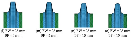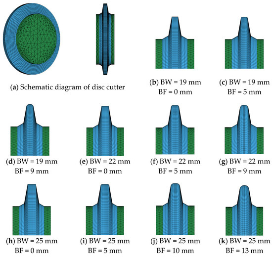 To figure out the influence of blade width (BW) and blade fillet (BF) on the disc cutter when breaking rock, 14 different blade types of disc cutters with combinations of four different blade widths (19 mm, 22 mm, 25 mm, and 28 mm) and six different blade fillets (0 mm, 5 mm, 9 mm, 10 mm, 13 mm, and 15 mm) were established. In addition, the force of these 14 types of disc cutter were discussed under different penetration and speed conditions. These 14 kinds of disc cutter are shown in Figure 12.