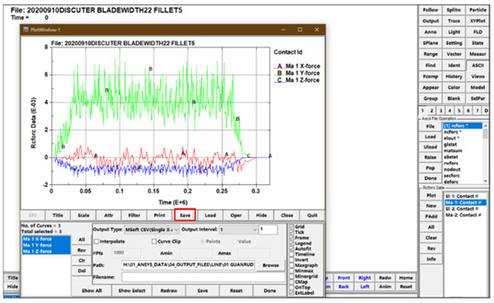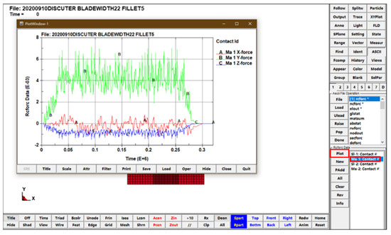 From LS-DYNA, the contact force between the disc cutter and the rock at each moment can be extracted, and the range and standard deviation can be calculated on the basis of the extracted contact force. The steps to extract contact force are shown in Figure 13, Figure 14 and Figure 15.