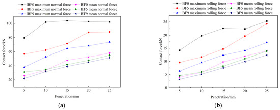 It can be seen in Figure 16a,b that, among the three types of disc cutter with different blade fillets and a blade width of 22 mm, the contact force of the disc cutter with a blade fillet of 0 mm was smaller than that of the disc cutter with a blade fillet of 5 mm and larger than that of the disc cutter with a blade fillet of 9 mm when the penetration was 5 mm. Its growth rate was faster, and its contact force was obviously greater than that of the other two kinds of disc cutter when the penetration exceeded 10 mm. When the penetration was 5 mm, the contact force of the disc cutter with a blade fillet of 5 mm was greater than that of the others, but with increasing penetration, the increment in the contact force was smaller, and the growth rate was relatively stable. The contact force of the disc cutter with a blade fillet of 9 mm was smaller than that of the others under all penetration conditions, and with increasing penetration, its increment was relatively stable and approximately linear.