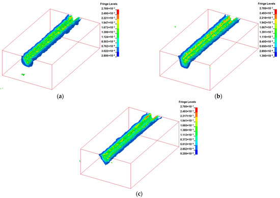 Equivalent stress isosurface of rock breaking using disc cutter with 22 mm blade width. (a) Isosurface of equivalent stress (Blade fillet 0 mm); (b) Isosurface of equivalent stress (Blade fillet 5 mm); (c) Isosurface of equivalent stress (Blade fillet 9 mm).