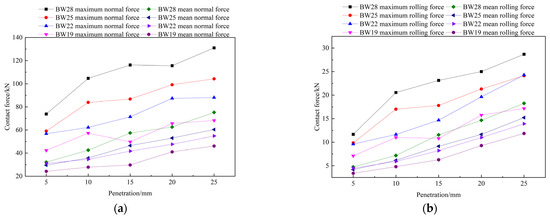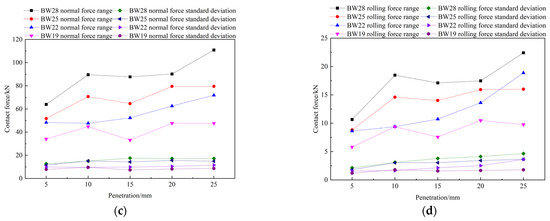Figure 19 shows the contact force, contact force range and standard deviation of four kinds of disc cutter with the same blade fillet (5 mm) and different blade widths (19, 22, 25 and 28 mm) at different penetration depths (5, 10, 15, 20 and 25 mm). It can be seen from Figure 19a,b that with the same blade fillet, the wider the blade width, the greater the contact force. As can be seen from Figure 19c,d, with the same penetration, the range and standard deviation of contact force both increase with increasing blade width.