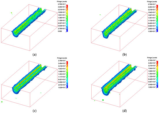 Equivalent stress isosurface of rock breaking using disc cutter with 5 mm blade fillet. (a) Isosurface of equivalent stress (Blade width 19 mm); (b) Isosurface of equivalent stress (Blade width 22 mm); (c) Isosurface of equivalent stress (Blade width 25 mm); (d) Isosurface of equivalent stress (Blade width 28 mm).