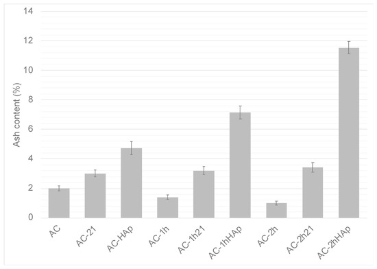Ash content in percent of the different carbons tested (AC: activated carbon; 21: 21 days incubated; Xh: oxidized time; HAp: incubated for 21 days with CaSiO3).