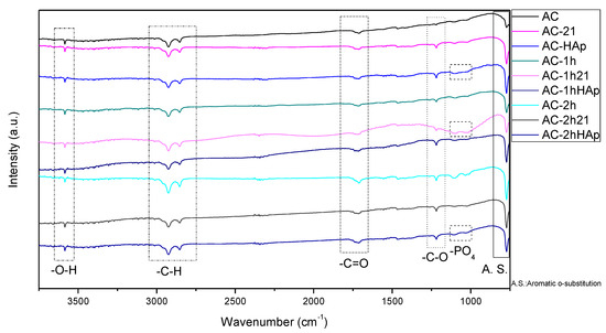 The differences between the samples were the intensity of the signals. Initially, at 3584 cm−1, a small and sharp peak was observed and corresponded to an O-H tension due to the hydroxyl that was present in the material since phenols were formed in the activation process [24]. The spectral bands around 2924–2853 cm−1 belonged to the C-H stretching. Moreover, certain bands were appreciated between around 2400 and 2350 cm−1, according to the C=O bond tension [25] and the overtones of the carboxylic groups, due to the oxidation process. Small signals at 1712 cm−1 attributed to a band belonging to carbonyl stretching. In addition, all the materials had a very sharp band at about 1219 cm−1 that was interpreted as a C-O strain, which increased considerably in the modified materials. Finally, at 775 cm−1, they corresponded to an aromatic substitution of the ortho type by the formation of the compounds with C present in the aromatic group and another element or a bond with an active site. Small signals of the phosphate group were observed at 1116 and 1085 cm−1, corresponding to HAp. An increase in the intensity of the AC-1h21 for the phosphate group signal can be attributed to the initial formation of HAp on the surface.