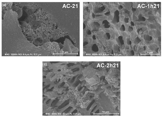 Figure 4 shows the micrographs of the oxidized materials. The 1 h (AC-1h) and the 2 h (AC-2h) oxidized carbon presented a change in the morphology, with a more irregular surface and an increase in the pore diameter; likewise, a skeletal morphology [27] in the material with a 2 h oxidation is observed. The change in morphology is directly related to the chemical oxidation with HNO3 [28], as the acid in contact with the material modified the textural properties, increasing the surface porosity due to the carbon bonds’ degradation.