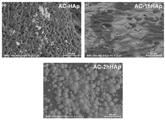 SEM microscopies of the HAp-modified carbon samples; (a) AC-Hap, (b) AC-1hHAp, and (c) AC-2hHAp.