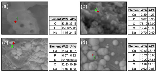 For the samples incubated for 21 days, shown in Figure 5, typical HAp morphology was not observed; however, a dispersion of the ions and an initial growth of HAp were observed in a slight shining on the SEM images of the composite surface. The reason is that the Ca2+ ions’ concentration was insufficient for the spontaneous precipitation process to take place [22,23].
