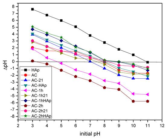 To comprehend the adsorption mechanism on the samples, charge distribution experiments were carried out. Figure 8 shows the charge distribution of the materials studied, according to the method reported by Mahmood et al., 2011 [33]. The hydroxyapatite presented a basic behavior characteristic, with a PZC of 10.91, while the rest of the materials (the AC and its respective modifications) had a more complex character and a PZC that varied depending on the oxidation degree and the CaSiO3 addition.
