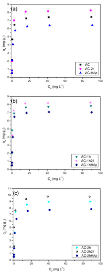 Batch adsorption experiments were carried out, and the corresponding isotherms were performed. Figure 9 presents the adsorption isotherms of the non-oxidized materials (AC, AC-21, and AC-HAp in Figure 9a), the oxidized materials for 1h (AC-1h, AC-1h21, and AC-1hHAp in Figure 9b), and the materials oxidized for 2h (AC-2h, AC-2h21, and AC-2hHAp in Figure 9c) in varying initial concentrations.
