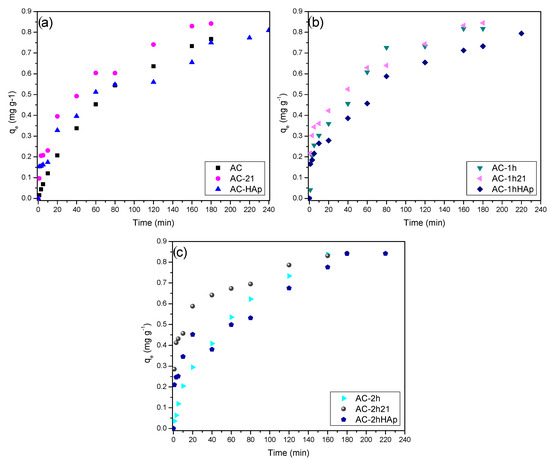 To understand the adsorbents kinetic behavior, Figure 10 shows the experimental data. For all the adsorbents studied, the equilibrium time was longer. Due to the AC precursor (the coconut shell) the pore distribution was characterized by a high presence of micropores and a high surface area [35], and therefore, the equilibrium time was longer.