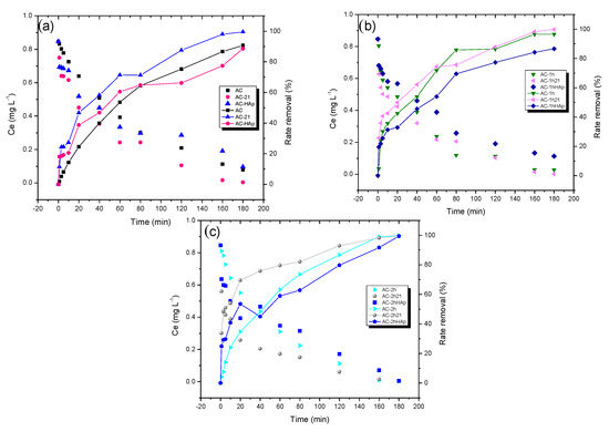 Effect of contact time as a function of the adsorbed concentration and removal rate of each material studied at experimental conditions of: 1 ppm, pH 7, and an initial dose of 60 mg. (a) Samples without oxidation, (b) samples with 1 h oxidation, (c) samples with 2 h oxidation.