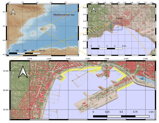 The port of Palma de Mallorca is located in the city of Palma, on the island of Majorca (Balearic Islands, Spain; see location in Figure 1) in the Western Mediterranean Sea, with approximate coordinates of: 2°38.4′ E, 39°33.7′ N. The management resides at the Port Authority of the Balearic Islands in a landlord governance model. From the impact on water quality degradation and environmental management, the port has the following characteristics: (i) Strong Port–City relation. (ii) Development of several different port activities (i.e., recreational boating, transport of passengers and goods, fishing, repair and maintenance of boats and restoration and services on land). (iii) Sporadic discharges of rainwater through four gullies and several collectors of stormwater drainage networks, in some cases with risk of discharge of mixed rainwater and wastewater.