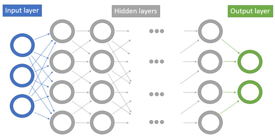 An artificial neural network is a collection of connected nodes which loosely model the neurons in a biological brain [26]. Each connection, like the synapses in a biological brain, can transmit a signal to other neurons. When an artificial neuron receives a signal, it processes it and, as a result, sends outputs (real numbers) to neurons connected to it. In turn, the output signals of each neuron are computed by some non-linear function of the sum of its inputs. Typically, neurons are aggregated into layers; different layers may perform different transformations on their inputs coming from the one before. Signals travel from the first layer (or input layer) to the last one (or output layer). Figure 2 depicts schematically how neurons in different layers interact to provide meaningful results.