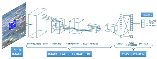 In this context, it is important to note that pollution discharge events in ports are, in most cases, visually perceivable. Consequently, it seems feasible to investigate the possibility of establishing automated monitoring systems for these discharges using cameras installed at strategic points in the port. Associated with automatic image analysis systems, computer vision techniques seem an excellent complement according to previous experiences in other fields for detecting and recognition [12,13,14]. Computer vision techniques have recently experienced a quick evolution, being implemented in a wide range of different applications with high efficiency and performance [15,16,17]. Deep learning on convolutional neural networks is proven to achieve very high performance on computer vision tasks [18]. In fact, remote sensing technology is proven to provide spatially synoptic and near real-time measurements that can be effectively used to detect and manage pollutants such as suspended sediments, oil and chemical spills, algal blooms and high suspended solids [7,19]. Additionally, recent contributions in waste and pollutant detection used Image Classification based on deep convolutional networks [20,21]. Such approaches have been successful at addressing pollution detection in large surface areas. In the case of port waters, satellite images cannot be used due to poor image resolution, and a monitoring system tailored to smaller scales has to be generated. Specifically, a computer vision system, supported by “in situ” mounted camera images would be a robust alternative for water pollution monitoring at ports. This system would allow continuous and low-cost monitoring of surface water pollution, addressing the limitations of traditional observational techniques. In addition, it would constitute a leap forward in the digitalization of ports through the practical application of artificial intelligence technology in coastal infrastructures at limited cost. It is important to note that the aim of this novel monitoring system is not only to give warnings for each discharge so that immediate action can be taken, especially in particularly relevant episodes that generate a significant risk for health or navigation, but also to obtain knowledge about the discharges that threaten the port waters where and when they happen or if they are related to specific operations. In consequence, computer vision, combined with traditional or Artificial Intelligence based analysis, may provide operational knowledge in specific port areas and facilities, thus allowing development of adequate environmental management strategies.