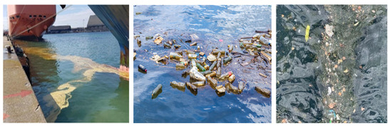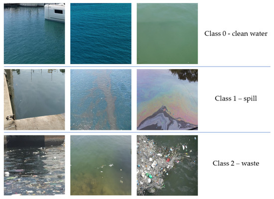 The selection of the clean, spill and waste classes has been carried out after careful consideration of the nature of pollution in ports as well as the level of detail that is useful in port environmental management activities. Specifically, spills in ports have four main origins (although in specific ports or terminals there may be others): users on land, users on boats, discharges of mixed drainage networks and port operations. Considering their physical and chemical nature, there is an enormous variety in waste and contaminants that can reach port waters, including suspended matter, hydrocarbons or eutrophication (not a spill in itself, but a consequence of a nutrient spill) (see Figure 4). Identification of both the origins and chemical nature of spills could be pursued, but the applicability of such information is very limited; all these contamination events are managed in a similar fashion and thus their identification would not provide any relevant input in port environmental management. In contrast, a type of pollution that follows a different type of action from a port environmental management perspective is floating waste (see Figure 4). Consequently, for the computer vision system designed, two categories of pollution have been considered, namely spill and waste. The spill class (class 1 in this study) refers to liquids mixing and/or diluting in the water, or to clouds of suspended solids. The waste class refers to large individual solids floating on the water or near the surface (class 2 in this study). Finally, clean water has been labelled as class 0. These three classes provide sufficient information for a port environmental management system to take relevant decisions on time and cost.