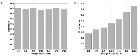 Figure 6a shows the Accuracy (y-axis) versus the image class ratio (x-axis) in the different simulations carried out. In this figure, Accuracy remains relatively stable with changing proportions of images in the training and validation dataset. On the other hand, the Error index, formulated in the present study to be able to capture how adequate the system is in correctly detecting contamination alarms, shows that the performance of the system decreases significantly with an increasing disproportion of image classes (see Figure 6b).