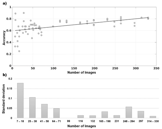 Figure 7a shows Accuracy in different simulations where image set sizes vary. Accuracy has been used in this experiment since it is a normalized parameter and thus easier to interpret graphically, but similar conclusions have been reached with the Error index in this case. Figure 7b shows how simulations with image set sizes lower than 297 images (99 images per class) generate a significant dispersion in performance. Dispersion shows a decreasing trend up to 99 images per class and from that point on there is no clear trend, remaining at moderate values. The number of 99 images per class is also the closest among those used to the benchmark of 100 images per class usually recommended for training Image Classification algorithms [27]. With datasets that have a number of images over this amount, Accuracy becomes stable and increases in a linear manner with increasing images provided to train and validate the algorithm. When carrying out a regression in datasets with over 99 images per class (297 total images), both linear and quadratics fits have been considered. Finally, a linear regression, shown in Figure 7a, was selected because the quadratic fit is only marginally better than the linear one and because the linear fit showed significantly more robustness. Robustness was here evaluated as the change in fit parameters when random datapoints are removed from the set of results. Thus, in the range of image set sizes considered in the study, also the relevant range for the application at hand, the Accuracy presents a linear tendency with increasing image set size after a certain number of images have been achieved.