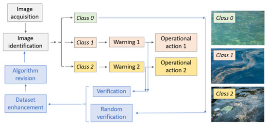 Figure 8 depicts how the proposed implementation would be carried out in practice. In addition to the image acquisition and identification of the three classes (with alarms generated when spill or waste were detected), with increasing waste and spill images a verification and dataset enhancement step would be prompted in the system. With the enhanced dataset, the algorithm would be revised in order to achieve gradually better Accuracy and Error index performance.