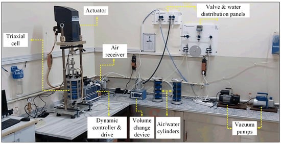 The dynamic triaxial experiments were conducted at Mus Alparslan University using a fully automated test system (Dynatriax EmS). The triaxial apparatus was manufactured by Wykeham Farrance—Controls Groups (Milan, Italy); its main components are shown in Figure 1.