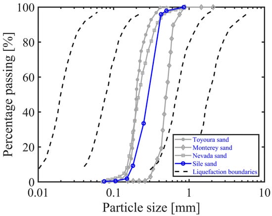 The triaxial specimens were prepared using Sile sand (AFS 55/60). Figure 2 presents the particle size distribution (PSD) curve of this sand and its comparison with different types of sand that are widely used in geotechnical laboratories around the world. Based on the liquefaction boundaries of Tsuchida [], it is a highly liquefiable soil. The index properties of Sile sand are given in Table 1.