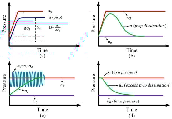 Schematic representation of test stages: (a) Saturation; (b) Consolidation; (c) Shearing; (d) Dissipation of excess pore pressures.