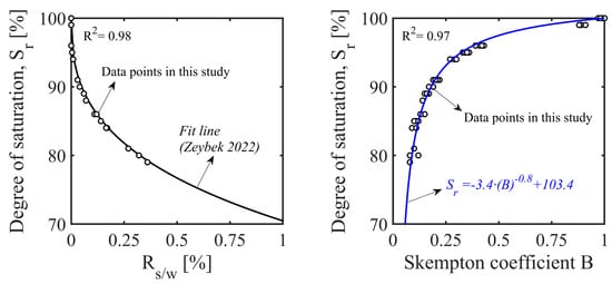 Zeybek [] conducted a series of beaker tests on partially saturated sand specimens prepared with a sodium percarbonate–water solution and established a correlation between the weight of the sodium percarbonate normalized with that of the de-aired water () and the degree of saturation (). The prediction of his empirical equation was compared with the experimental data accomplished in the current study. Figure 5 shows that the degree of saturation () was reduced as the sodium percarbonate concentration in the aqueous solution was increased, and this trend was captured well by the empirical relation proposed by Zeybek []. Figure 5 also contains a plot of the degree of saturation values against the B measurements that shows a drop in the degree of saturation from nearly 1 to 0.8 as the B value decreased from almost 1 to 0.08; the power function in Equation (7) appeared to provide the best fit line for these datasets.