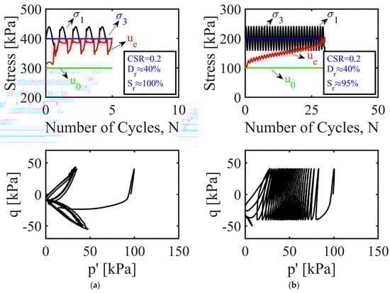 Typical experimental results in terms of excess pore pressure () generation and effective stress paths () are presented in Figure 6 to show the liquefaction behavior of the nearly/fully and partially saturated sand specimens. The plots on the left-hand side of the figure (Figure 6a) show the triaxial test data for loose, fully saturated sand ( 100%) tested under a back pressure of 300 kPa and an initial effective confining stress of 100 kPa. The results on the right-hand side (Figure 6b) correspond to test data for loose, partially saturated sand ( 95%) examined under a back pressure of 100 kPa and an initial effective confining stress of 100 kPa. In both cases, the specimens were subjected to a cyclic-stress ratio of 0.2.