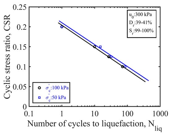 Figure 7 shows the liquefaction-resistance curves for the nearly/fully saturated sand specimens. It can be seen that the CSR at a given decreased as the increased from 50 to 100 kPa. This implied that under comparable loading and experimental conditions, the resistance of the nearly or fully saturated sands to liquefaction was reduced with an increase in the initial effective confining stress. This result agreed with many research findings in the field of soil liquefaction [,].