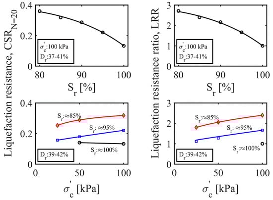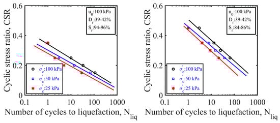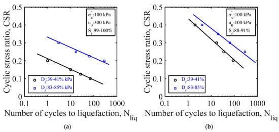 Figure 8 exhibits the cyclic liquefaction-resistance curves obtained from two sets of tests conducted at two different degrees of saturation (e.g., 94–96% and 84–86%). It appeared that for a constant relative density, back pressure, and degree of saturation, the CSR at a specific increased as the initial effective confining stress was increased from 25 kPa to 100 kPa. This indicated that the partially saturated sand specimens were more resistant to liquefaction at high effective confining stresses. Similar observations were made in previous studies [,].