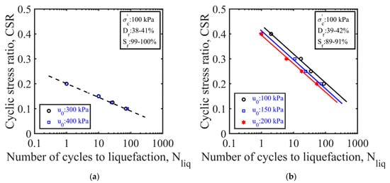 Effect of back pressure on liquefaction resistance of sand: (a) nearly/fully saturated sand specimens; (b) partially saturated sand specimens.