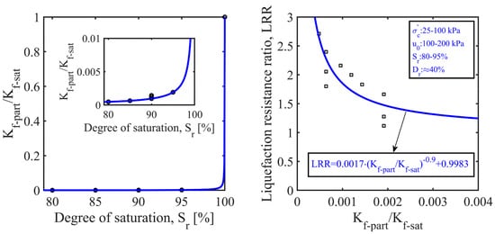 It can be observed in Figure 13 that the bulk modulus of the pore fluid significantly dropped as gas bubbles were generated in the nearly/fully saturated sand specimens. The reduction in the degree of saturation of the partially saturated sands was followed by a reduction in the bulk modulus of the pore fluid. This figure also reveals that the liquefaction-resistance ratio increased with a decreasing pore-fluid bulk modulus or an increasing-pore fluid compressibility, which was the reciprocal of the bulk modulus ().