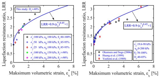 The maximum volumetric strain () incorporates the effects of several parameters that govern the liquefaction response of partially saturated sands. Establishing a direct correlation between the liquefaction-resistance ratio () and maximum volumetric strain is of great importance in engineering. The maximum volumetric strains were calculated using Equation (3) for different initial conditions that were considered during the experimental work in the present study. The calculated values are plotted against the liquefaction-resistance ratios () on the left-hand side of Figure 14; a power function describing the general trend was proposed as follows: