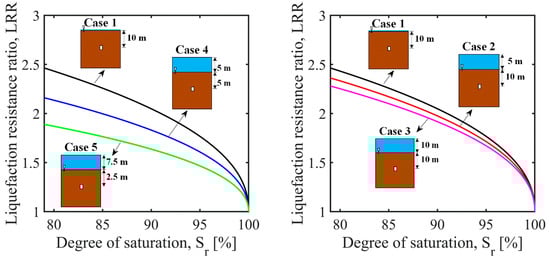 Figure 9 depicts the variation in the with at different degrees of saturation in the range of 79–100% under a constant relative density, effective confining stress, and back pressure. The cyclic-stress ratios at the same number of cycles were found to increase as the nearly/fully saturated sand specimens were desaturated using the IPS method. Irrespective of the level of saturation, the liquefaction resistance of the partially saturated specimens was larger than that of the nearly/fully saturated specimens. Further improvement in the liquefaction resistance was obtained via a further reduction in the degree of saturation, which was in agreement with previous experimental observations [,,,].
